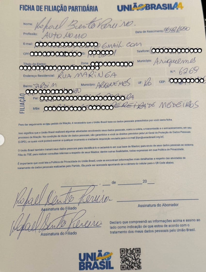A acusação central de Fera é que Maurício Carvalho teria divulgado a ficha assinada com o objetivo de criar um fato político — ou seja, de tornar público o compromisso antes que o recuo pudesse apagar qualquer vestígio da negociação. É possível, e até provável, que a divulgação do documento tenha sido estratégica por parte do União Brasil. Mas a questão de fundo permanece: quem assinou a ficha foi o próprio Rafael Fera. Ninguém o forçou a colocar a caneta no papel.